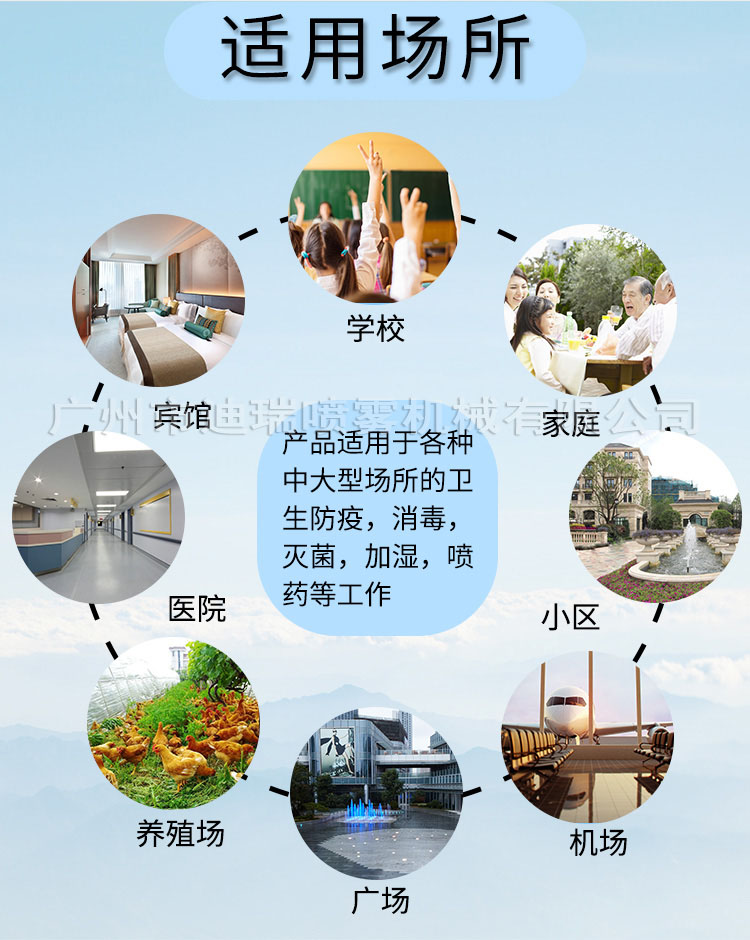 噴霧系統(tǒng)運用的案例含噴霧消毒、人造霧景觀、噴霧除臭、除塵等。